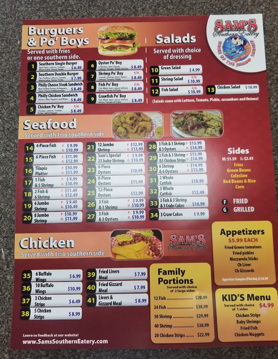 Welcome to Sam's Southern Eatery, your go-to destination for authentic Southern flavors at 6350 Benton Rd, Benton, LA. With a menu designed to satisfy seafood lovers and comfort food enthusiasts alike, Sam’s offers a delightful range of dishes that celebrate the heart of Southern cuisine.